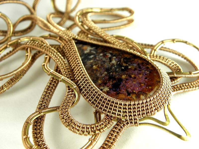Mon exploration m’a conduit à la découverte de la pâte de métal et au travail de créateurs talentueux comme Lisa Barth. Inspirée par ses créations en pâte de métal et ses techniques de tissage de fils, j’ai trouvé une nouvelle direction pour mes bijoux. Après des heures de recherche et de pratique intense entre 2009 et 2011, j’ai commencé à maîtriser l’art du tissage de fils de métal.